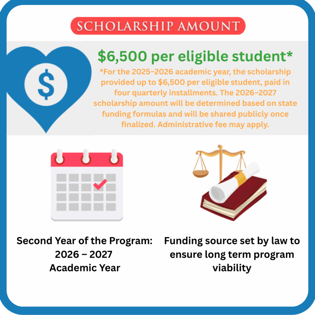 For the 2025/26 academic year, the scholarship provided up to $6,500 per eligible student, paid in four quarterly installments. The 2026/27 scholarship amount will be determined based on state funding formulas and will be shared publicly once finalized.