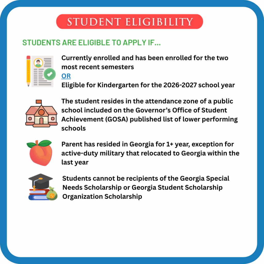 Students must be currently enrolled in a Georgia public school for two consecutive semesters or be rising kindergarten students.